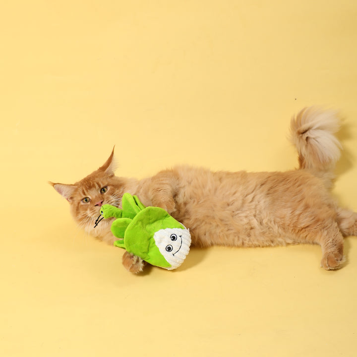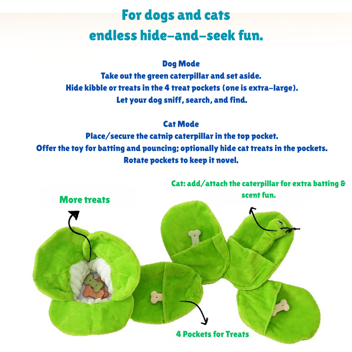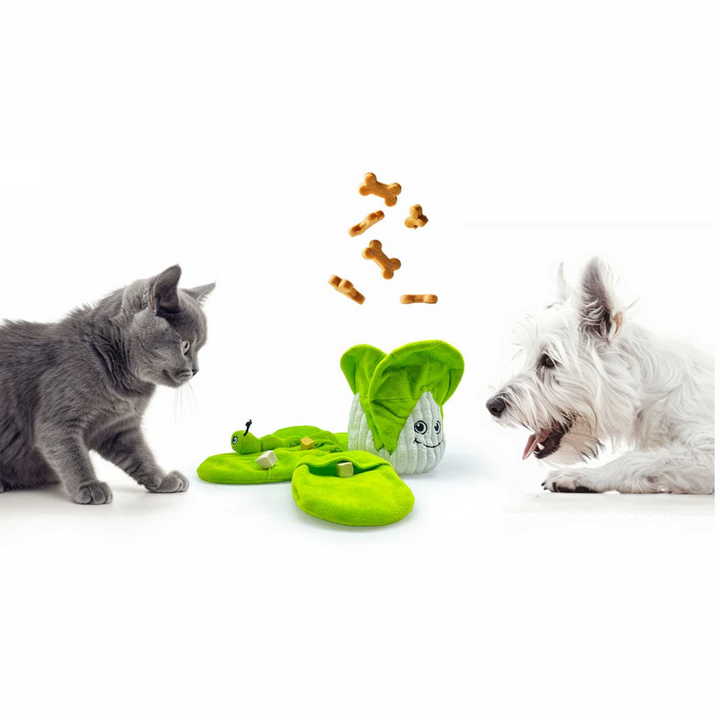 Transform mealtime into an engaging foraging adventure with the Fetch Hide-and-Seek Cabbage Plush Puzzle. This interactive toy features five removable velvety leaves concealing hidden treats, encouraging cats and small dogs to sniff, paw, and tug for their rewards. A cheerful caterpillar squeaker adorns the top while soft crinkle film provides auditory stimulation with every interaction. Designed with safety as a priority, it's crafted from AZO-free, non-toxic dyes and includes a BPA-free liner reinforced with double stitching. Durable enough for daily play and repeated digging, this puzzle toy delivers mental enrichment while keeping treat time tidy and controlled
